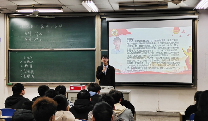 推荐优秀团员、青年作为党的发展对象是共青团发挥党的助手和后备军作用的重要体现,是党赋予共青团的光荣职责。为认真做好“推优”工作,向党组织输送思想上进、高素质的团员青年做发展对象, 根据《关于开展sunbet申搏官网2020-2021学年第二学期“团内推优”工作的通知》要求,3月23日,“团内推优”示范班——19软件工程2团支部推优大会在华罗庚馆202教室举行。此次大会,在校团委、院团委以及辅导员庄丽老师的监督下,支部39名共青团员共到场。