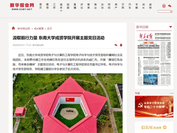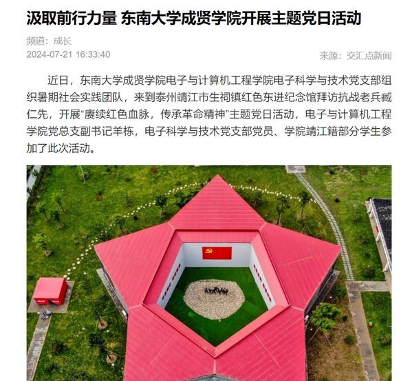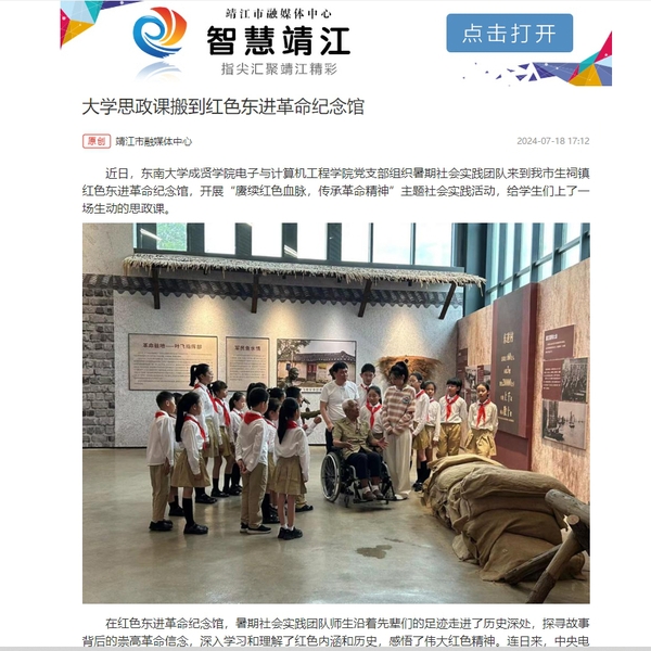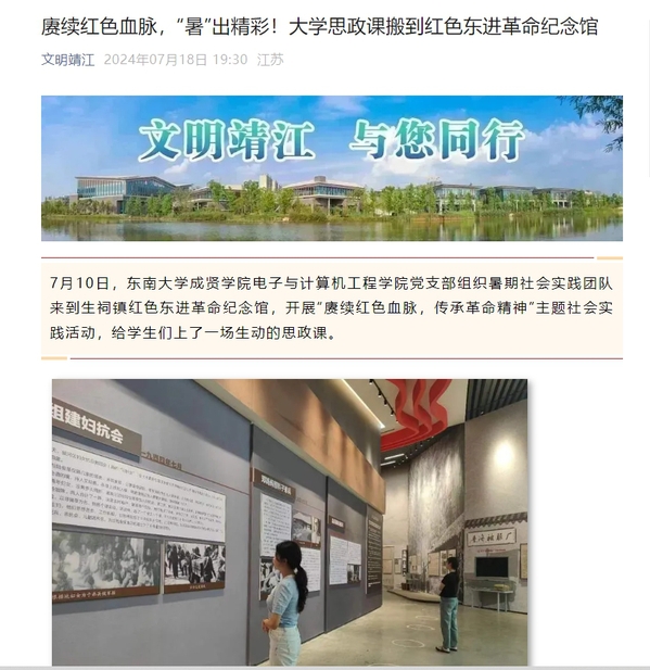在中国共产党成立103周年之际,为深入学习贯彻习近平新时代中国特色社会主义思想,全面贯彻落实党的二十届三中全会精神sunbet申搏电子科学与技术党支部组织暑期社会实践团队赴江苏省靖江红色东进革命根据地”开展“赓续红色血脉传承革命精神”主题社会实践活动公司师生通过走进“靖江市革命烈士纪念馆”、“红色东进纪念馆”,协助南京民间抗日战争博物馆走访抗战老兵臧仁先,协助中央电视台《和美古镇 忠义生祠》节目录制现场志愿服务活动等,让广大师生重温革命圣地,传承革命火种受到主流媒体《新华报业网》、新华报业旗下《交汇点新闻》手机客户端,以及《文明靖江》、《智慧靖江》等多家网络媒体的报道。