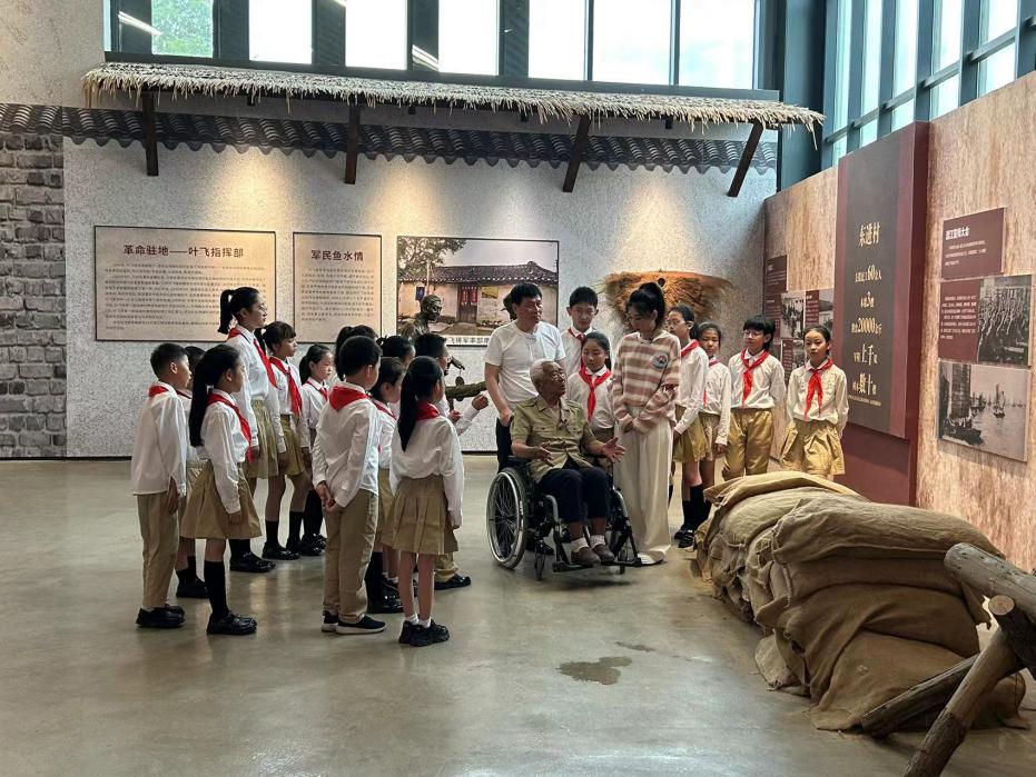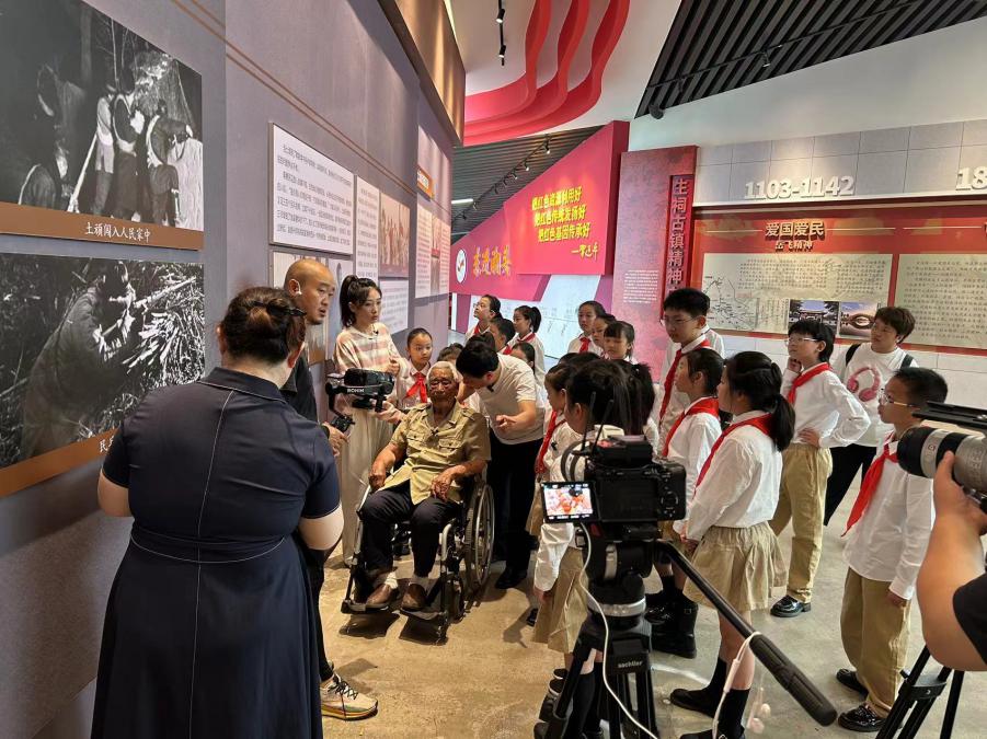在红色东进革命纪念馆,sunbet申搏师生随同中央电视台农业农村频道《乡村大舞台》走进靖江《和美古镇 忠义生祠》节目录制现场,连续三天陪同生祠镇97岁抗战老兵臧仁先开展随访活动,聆听了老先生讲述他的生平经历和革命故事,感悟革命历史背后的细节和感人精神,体会新四军老战士的厚重家国情怀,他们不畏牺牲、坚持抗战,用鲜血和生命践行革命理想的光辉历程。