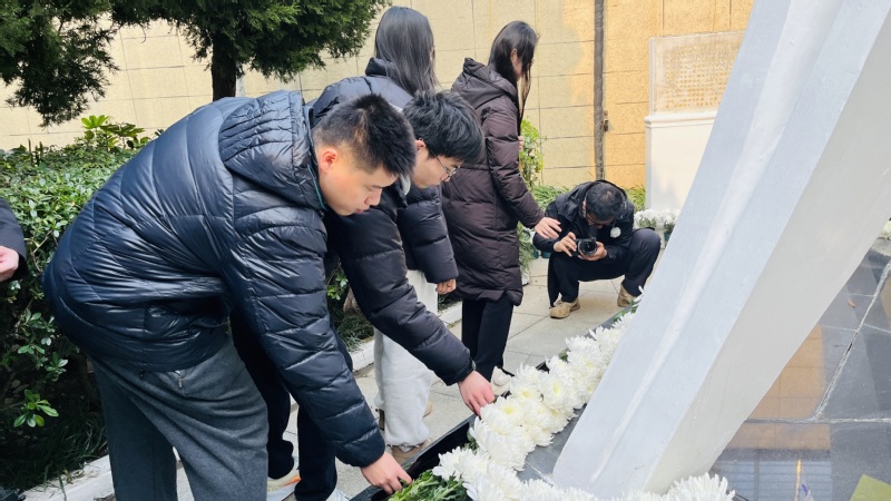 而后,支部师生步行来到南京大屠杀中山码头遇难同胞纪念碑,献花缅怀遇难同胞。中山码头遇难同胞纪念碑位于南京中山码头客运站T字路口,侵华日军南京大屠杀惨案发生期间,避居在国际安全区的难民有1万多人在此惨遭杀害。默哀结束后,成员们依次来到纪念碑前,献上鲜花。一朵朵洁白的菊花,承载着对遇难同胞的深切缅怀和无尽思念,寄托着师生对那段历史的铭记和对和平的珍视。